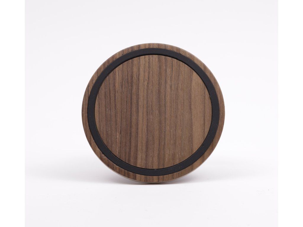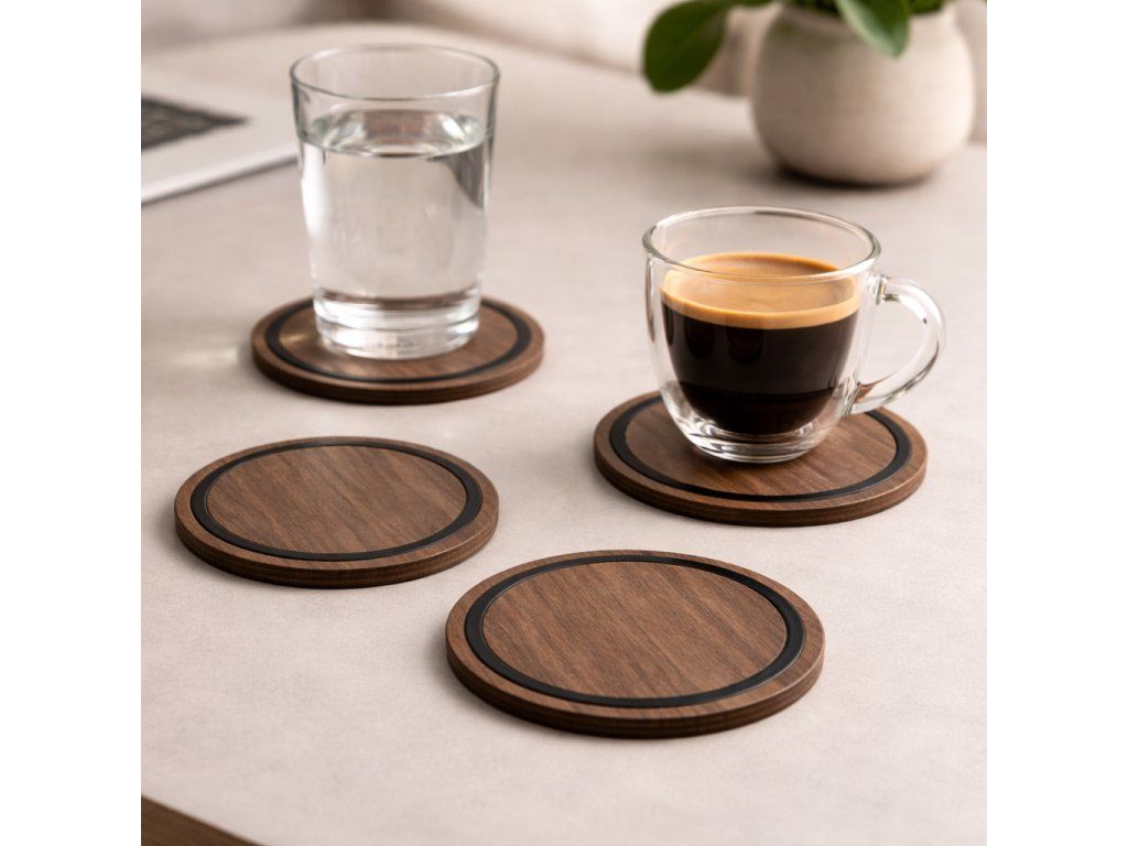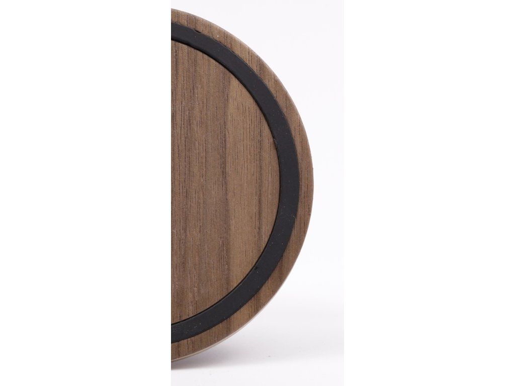 Podtácky z dýhy amerického ořechu s černým kovovým prvkem.