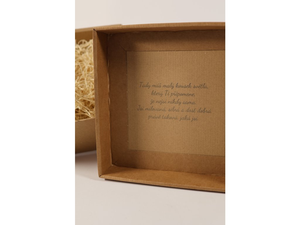 Osobní vzkaz skrytý uvnitř víka krabice. Malé překvapení, které zahřeje.