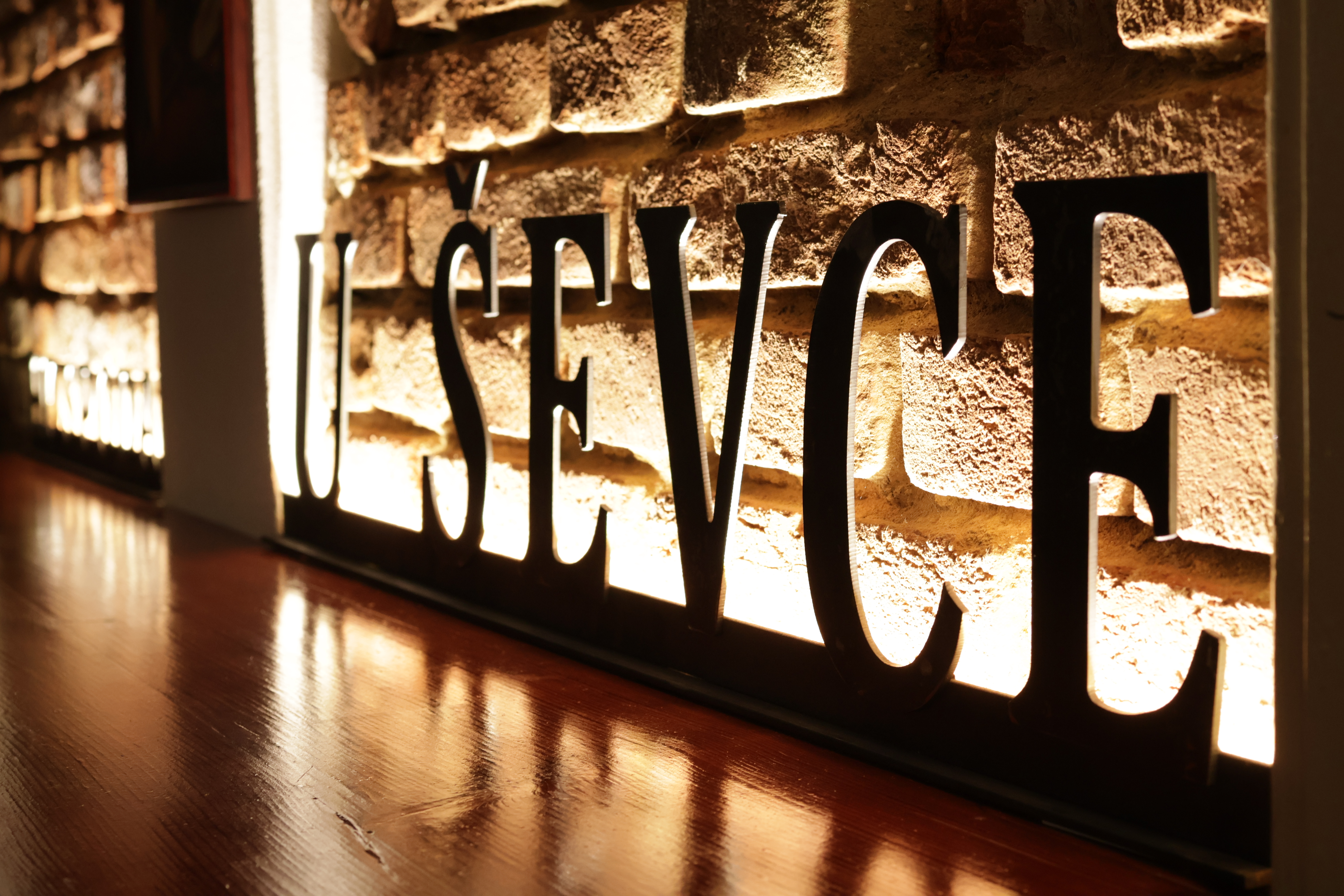 Od velké podsvícené cedule s logem, přes kovové nápisy na baru, až po držáky tácků a vlastní nástěnné hodiny – všechno vzniklo přesně podle přání majitelů.