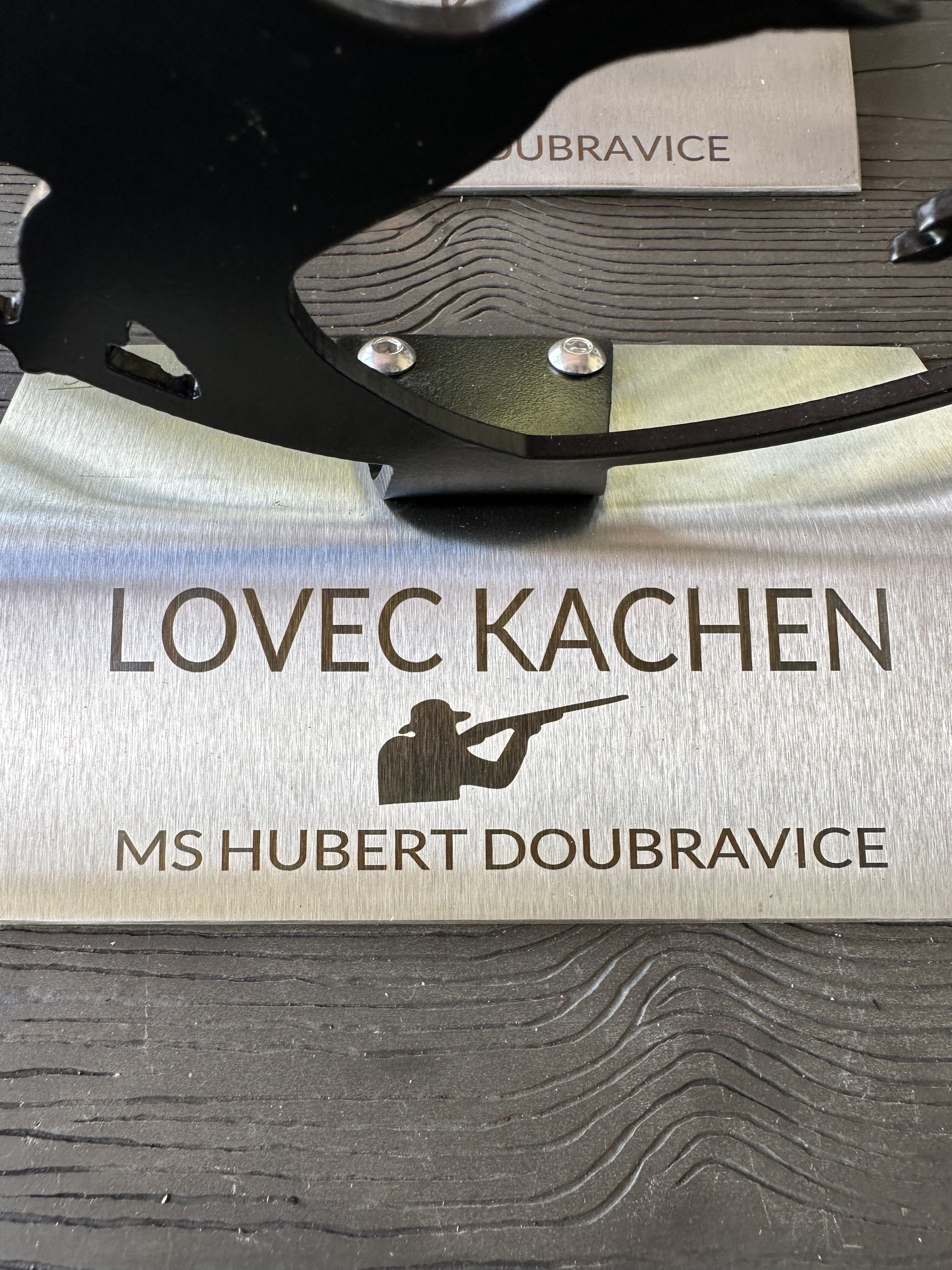 Společně se zákazníkem jsme ladili návrh, vybrali motiv letících kachen a rozhodli se pro gravírovaný nerezový podstavec s textem na míru. Finální trofeje jsme připravili ve dvou barevných variantách – černé a zelené.