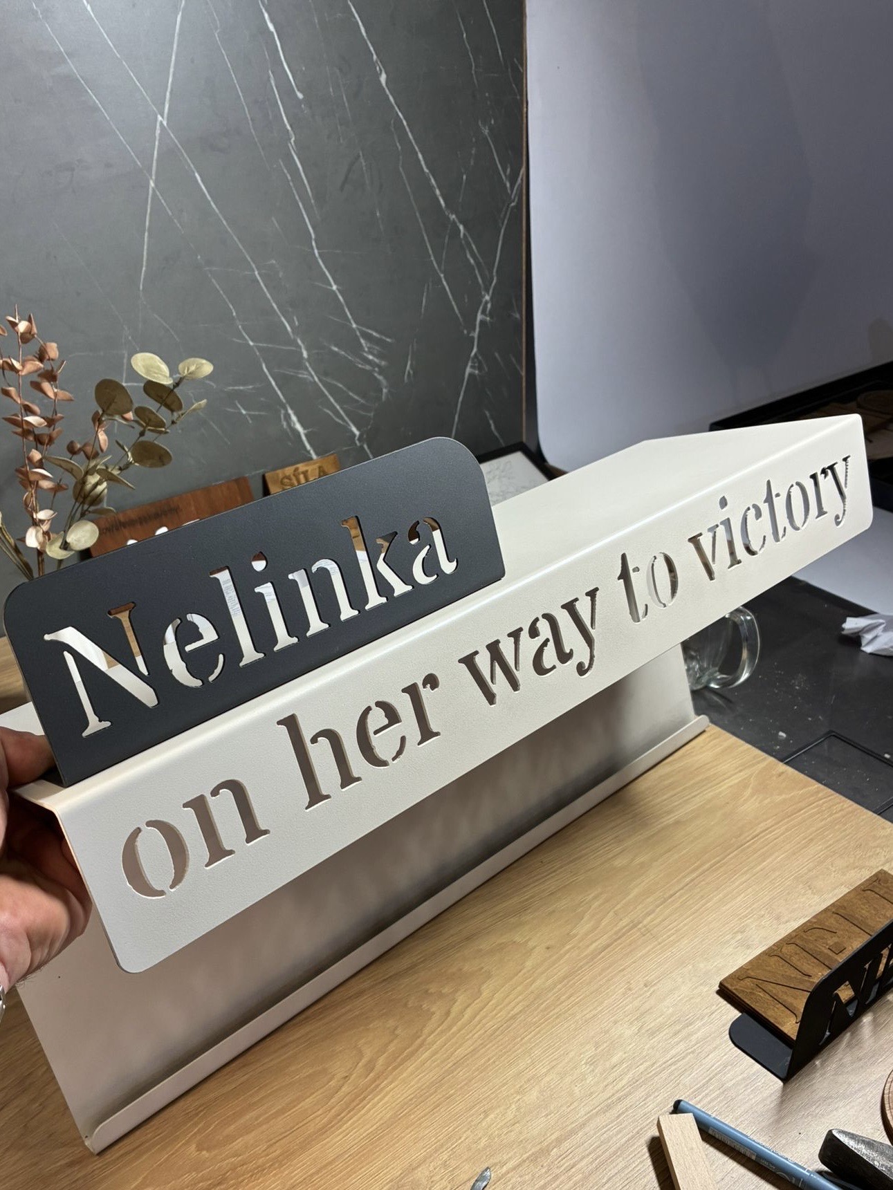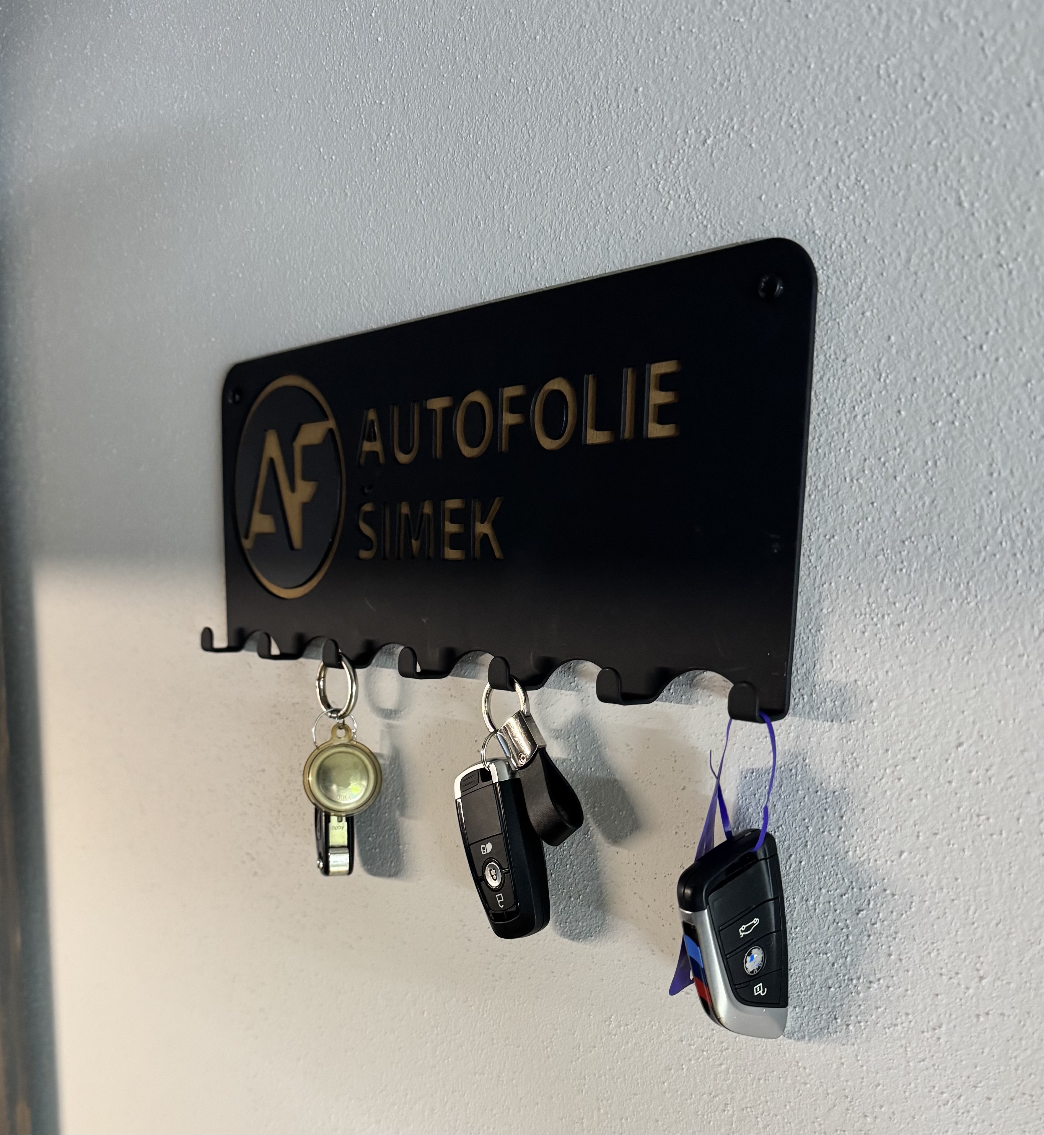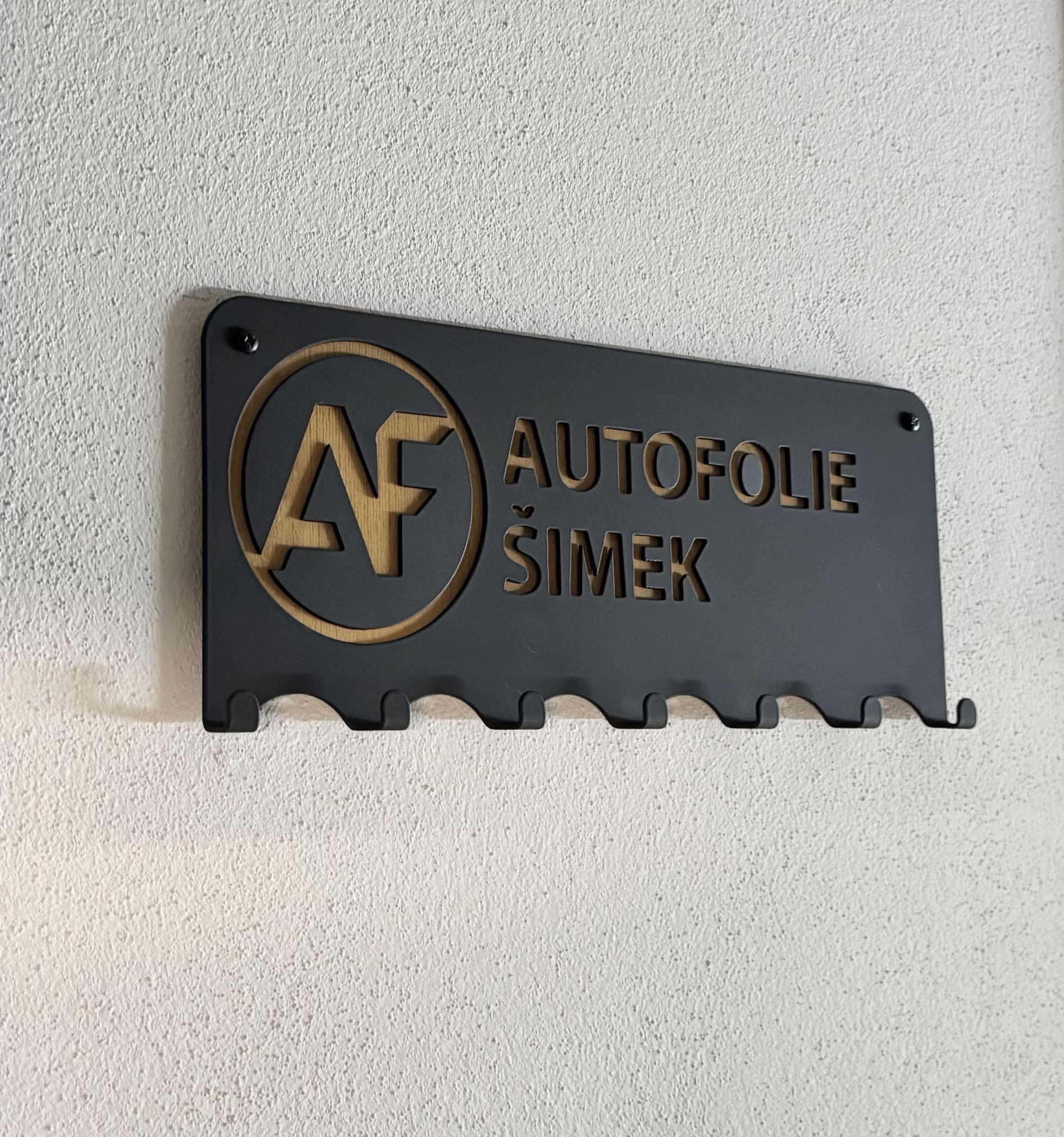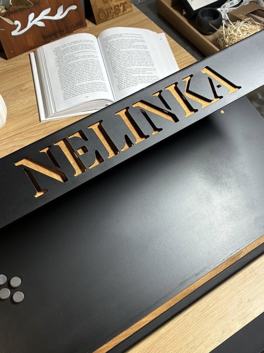 Minimalistický kovový držák s vyřezaným logem nebo názvem. Opět spojení kovu a dřeva. Pevná konstrukce, práškový lak a přesné zpracování. Skvělé řešení pro firmy, provozovny i domácnosti.