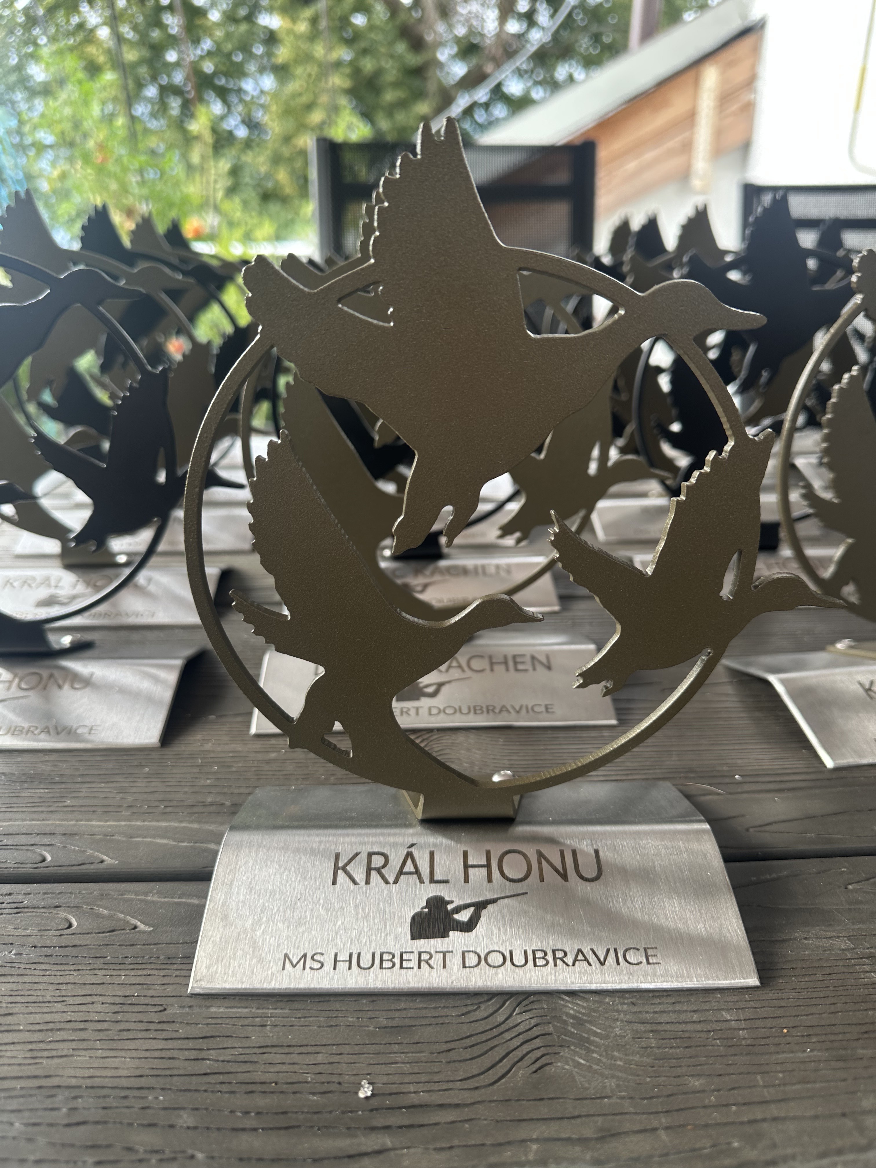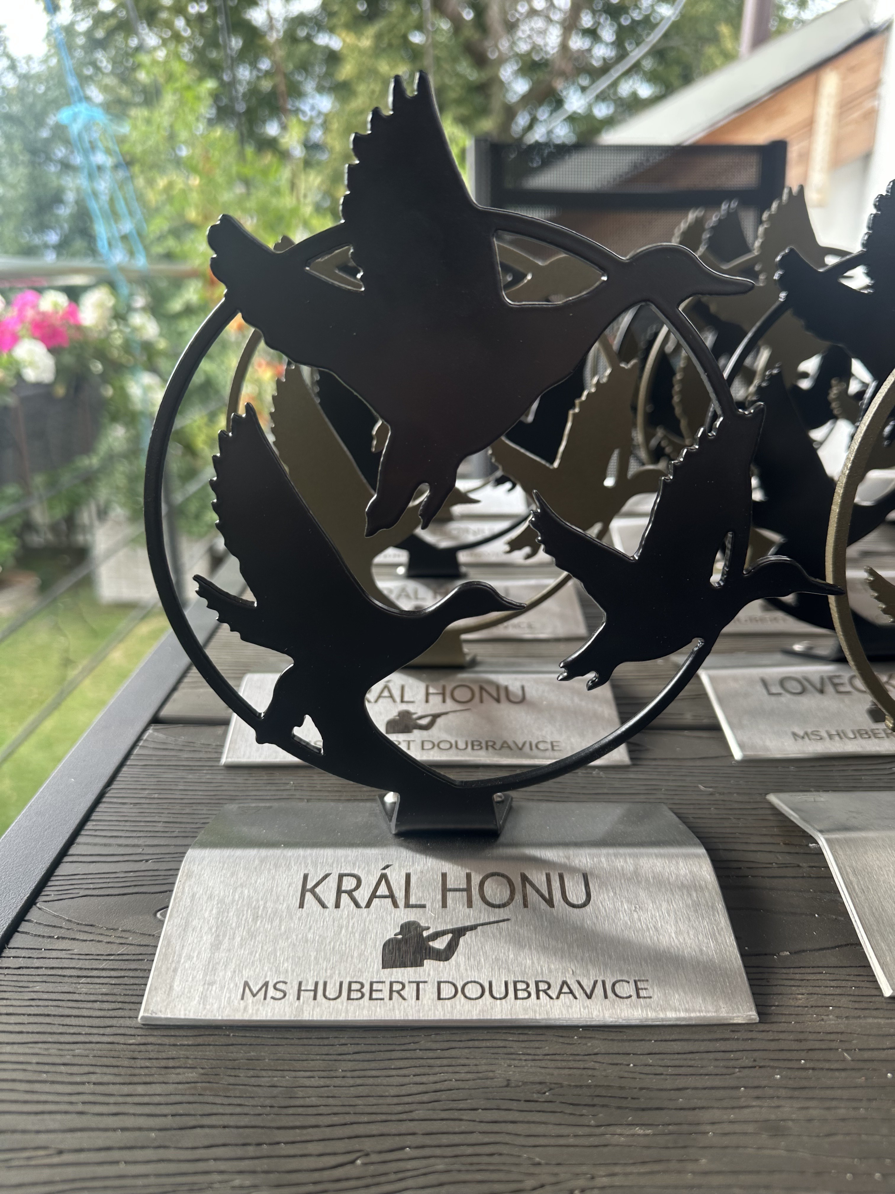 Společně se zákazníkem jsme ladili návrh, vybrali motiv letících kachen a rozhodli se pro gravírovaný nerezový podstavec s textem na míru. Finální trofeje jsme připravili ve dvou barevných variantách – černé a zelené.